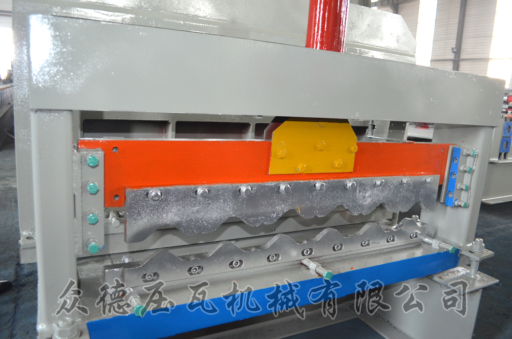 竹筒琉璃瓦机分为三部分,辊道成型部分,压型部分,切刀部分。辊道成型部分是由电机拖动,链条带动各辊转动。压型部分是液压缸带动模具上下移动,可以把彩钢压成许多节,形似琉璃瓦。切刀部分是液压缸带动刀具上下移动,可以把彩色钢瓦切断。生产过程如下:彩色钢板进入辊道成型部分,成型后到压型部分,压成等距离一节一节的,切刀负责定长切割。