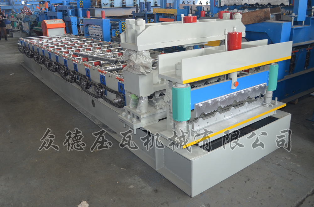 琉璃瓦压瓦机分为三部分,辊道成型部分、压型部分、切刀部分。辊道成型部分是由电机拖动,链条带动各辊转动。压型部分是液压缸带动模具上下移动,可以把彩钢压成许多节,形似琉璃瓦。切刀部分是液压缸带动刀具上下移动,可以把彩色钢瓦切断。