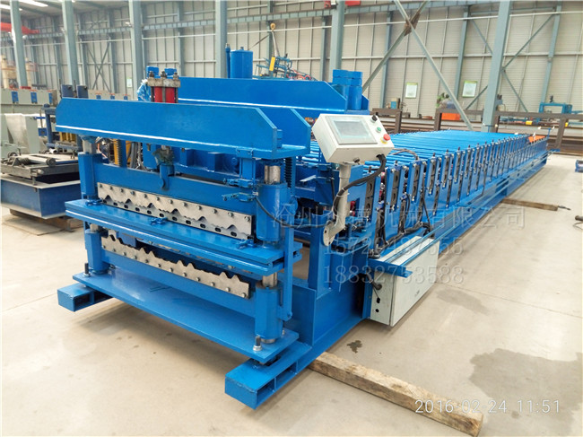 描述:此款双层琉璃瓦压型机器,为一机双型号琉璃瓦压型机,上层加工琉璃瓦,下层加工普通墙面瓦;电机的主功率为4KW,带动力强,该机器的滚轮采用机床加工而成,每个工件的精度!机器组装由钳工,水平测量组装。控制器为PLC电脑控制器,加工板材的厚度为0.2-0.8mm,全自动液压模具自动切断,生产,操作简单。
